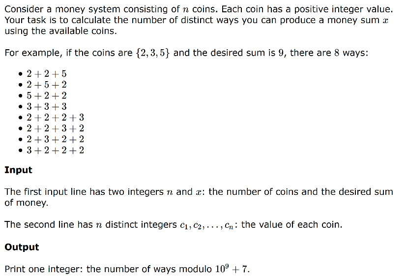 What we want here is a function: f(x) = number of ways, where x is the desired sum. So let’s follow the given example of 2,3,5. Lets say f(0) = 1, because there’s 1 way to make a sum of 0 and that’s not using any coins and f(1) = 0. Using the same logic as before, every time we want to find a solution for f(x), we should iterate over the coins list and subtract each one for x and add it to f(x). For this problem is should look like f(x) = f(x-2) + f(x-3) + f(x-5). BECAUSE we have array completely updated based on previous calculations, so when you want to find a solution, there are already many solutions to find the answer to the sub-problem. It’s hard to explain so lets go through this one together. So f(2) = f(x-2) = f(0) = 1 (because f(x-3) and f(x-5) are negative). This is correct because if we add the 2 coin to nothing we will get the desired sum of two. In the same vein f(3) = f(1)+f(0) = 1, f(4) = f(1) + f(2) = 1, f(5) = f(0) + f(2) + f(3) = 3. This is because if we add the 5 coin, we have 0 left to add to get the desired sum so there’s 1 way. If we take the 3 coin and subtract it from 5, we have a value of 2 to achieve before we get the desired sum, so we see what f(2) is because we already solved for it, and we see that there’s only one way to get the value of 2 because f(2) = 1. If we take the 2 coin and subtract it from 5 we see that we still have to get a value of 3 to meet the sum of f(5) so we see f(3) = 1. So we add 1+ 1+ 1= 3. Hence we keep on going and eventually we get that f(6) = f(1)+f(3)+f(4) = 2, f(7) = f(2)+f(4)+f(5) = 5, f(8) = f(3) + f(5)+f(6) = 6, and f(9) = f(7) + f(6)+ f(4)= 8, the correct answer. And to keep the value of the functions we create an array called dp[] which basically does all of this but stores f(x) in dp[x]. Check out my solution here.