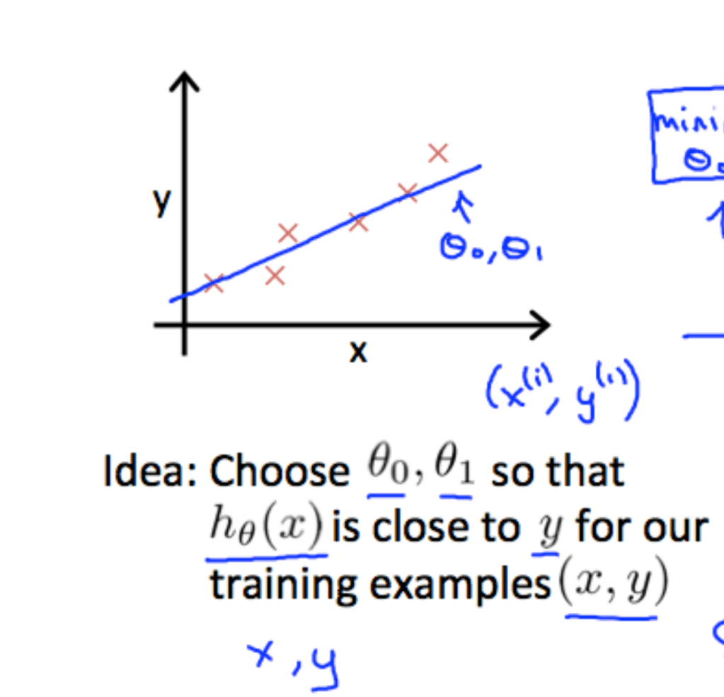 Now lets go into the math for developing an accurate formula for a supervised learning problem. Lets say that we have a graph of the size of house vs cost. Our goal is to analyze that data so we can create a model that can effectively predict what the cost of a specific size house is. As we can see from the graph (Fig-1), the best graph to make is a linear regression line. However, for the computer to recognize this is another mystery. So we want to make our hypotheses a linear line; y = mx + b. However, in machine learning we give it different syntax and say that h(x) [the hypothesis] = (theta1)x + (theta). Our goal is to choose theta and theta one so that when we plug in every x coordinate of the data set into the function h(x), the result will be as close as possible to the corresponding y value. To see how far off our line is from each of our data points we use a sort of complex formula called the work or cost function J(theta, theta1). There is another article here which can give you more information on the function mathematically.