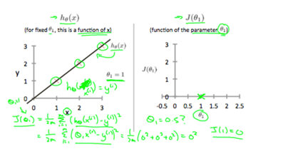 Let’s go to a more conceptual understanding of what the hypotheses and cost function really mean. Lets first assume that in h(x) theta is = 0, so h(x) is simply (theta1)x. Now our objective is to make theta such that the difference between the points and regression line is at a minimum. If we have the points (1,1), (2,2), (3,3), and we set theta1 to 1, we get our hypotheses line to correlate with the linear line y=x. As you can see if we take our cost function, also known as the squared function error, we will get a value of 0, because all the points are on the line.