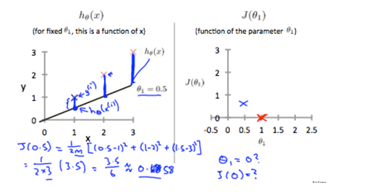 So, we create a new cost graph, and show that the cost when thetha1 = 1 is 0. If we say theta1 is 0.5 and take the squared function error to see the difference between our hypotheses and the points, we get a value of around 0.58. We then add this value to our graph.