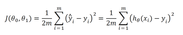 Though the equation does look daunting don’t worry we’ll go over it. Okay so the inside term is y^I – yi. y^i is basically the work function h(x). We subtract the value of h(x) from y (our actual point) for all points (that’s why we use summation). We square the expression because we eliminate any negative values. We use the 1/(2m) as simply a constant to make the math go easier.