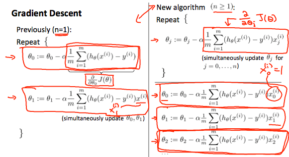 (Refer to Figure 1 first) Not a lot has changed from the last time we talked about gradient descent (please look at that article before reading on). It is hard to explain how the summation and 1/m comes into play, but when you take the partial derivative with respect to the variable that you are changing to the cost function you get the formula in the top right. This formula holds true for all cases even the base case because we set x0 to be 1 in all training examples because there is always a theta which does not have a x (for example y = thetax + theta). We say x0 is 1 because when we do theta transposed * elements of x the first element in the product matrix will be x0theta0 which is simplified to theta0.