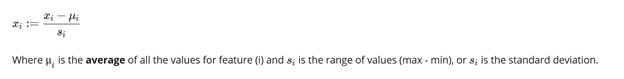 To make gradient descent more efficient, it is ideal to have input values that have very similar values. For example instead of 1000, 2000, and 3000 as data points, having 1, 2, 3 would make it easier for gradient descent to take steps on. Ideally, -1< x(i) < 1 (the most common range of values in machine learning). Two ways to help with making the data manageable are mean normalization and feature scaling. Mean normalization is dividing each of the values by the mean, and the latter is dividing each value by the range. To combine both these strategies the formula below is adopted:
